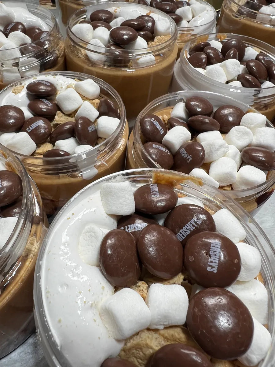 When you pick up a jar of Campfire S'mores you will think you are sitting around the campfire telling ghost stories and roasting marshmallows. Campfire S'mores starts with chocolate sauce then we layer in marshmallow fluff, homemade honey roasted peanut butter, Hershey bars, mini marshmallows and graham crackers....yes all in one jar.. It's a tough job but we made it work.