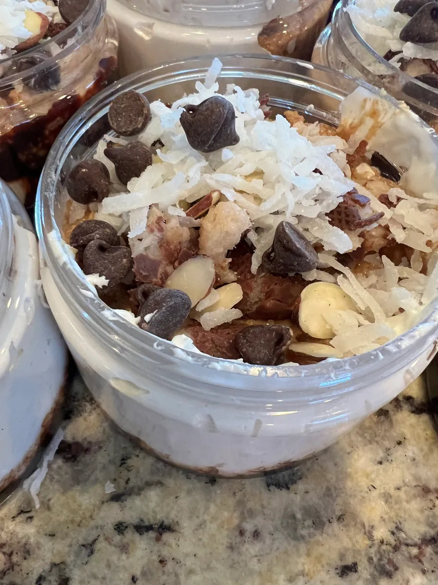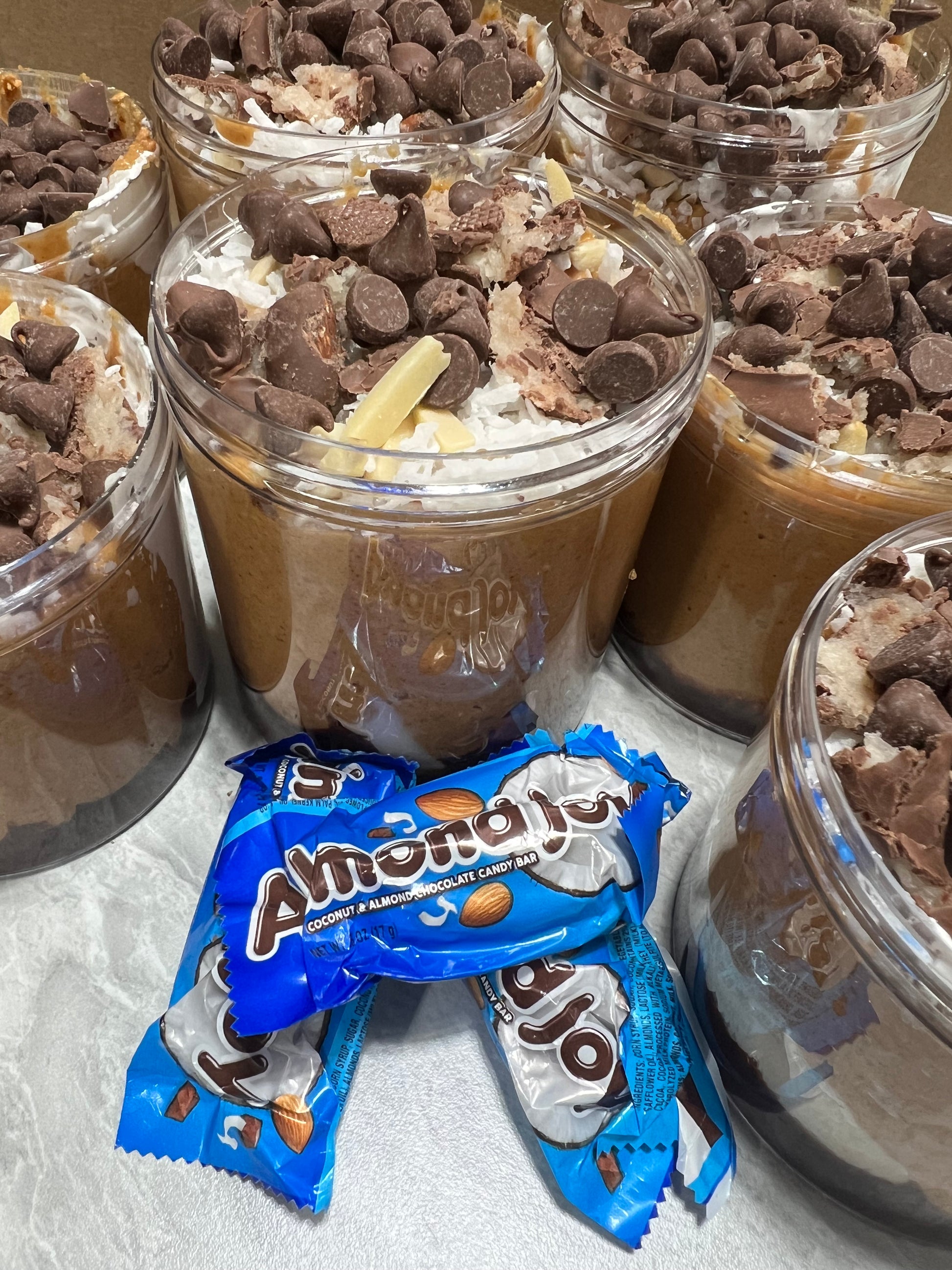 An amazing combination of chocolate sauce, fluffing (marshmallow fluff, cream cheese icing and shredded coconut), our homemade honey roasted peanut butter, Almond Joy candy, shredded coconut, milk chocolate chips and almonds.