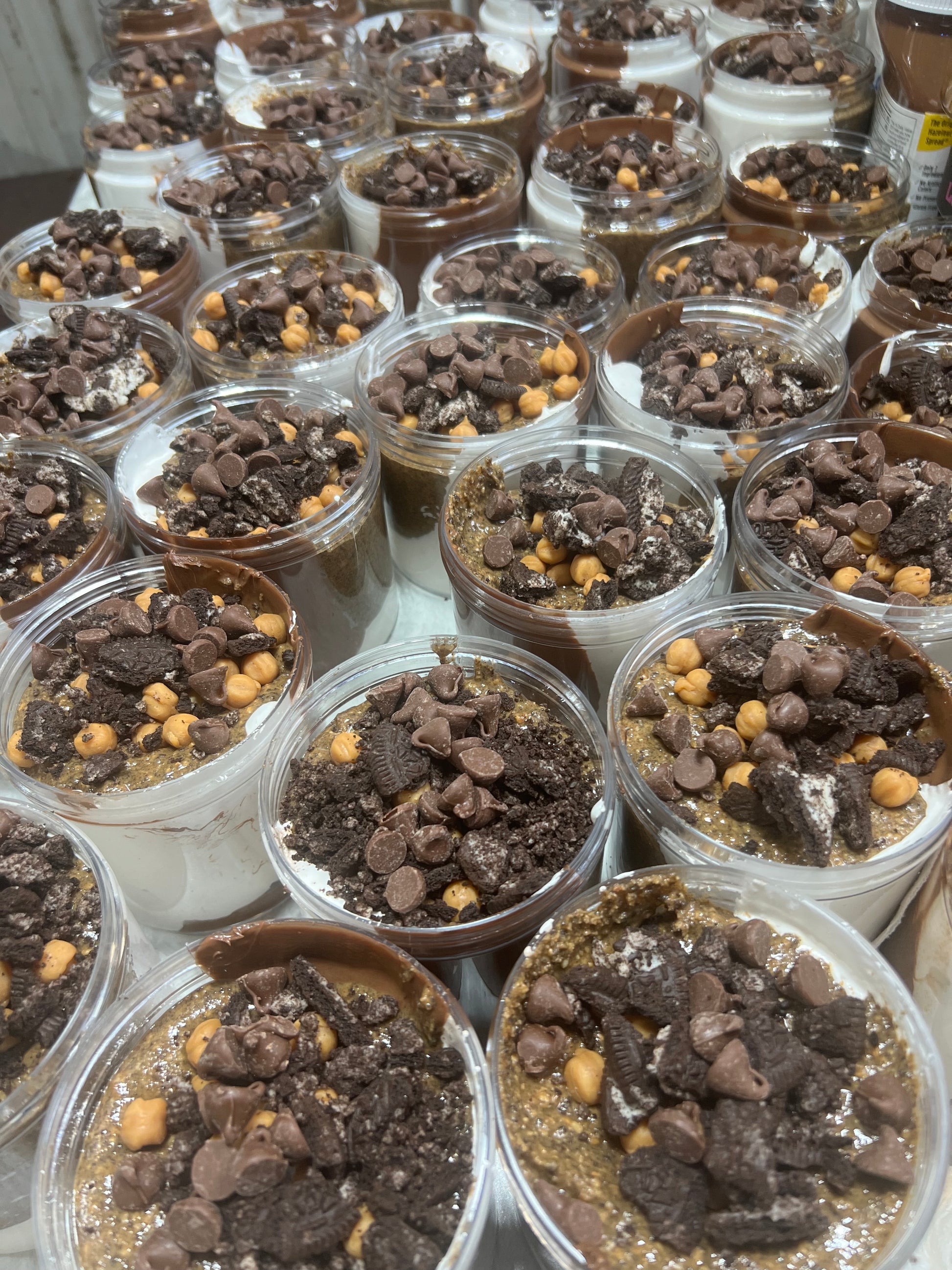 This jar is for the cookies and cream lover. Cookie Jar is layered with Nutella, marshmallow fluff, our original homemade Oreo honey roasted peanut butter, milk chocolate chips, Oreo crumbles and caramel bits. Your taste buds will thank you. Also, check out our jar of Oreo peanut butter with no toppings.