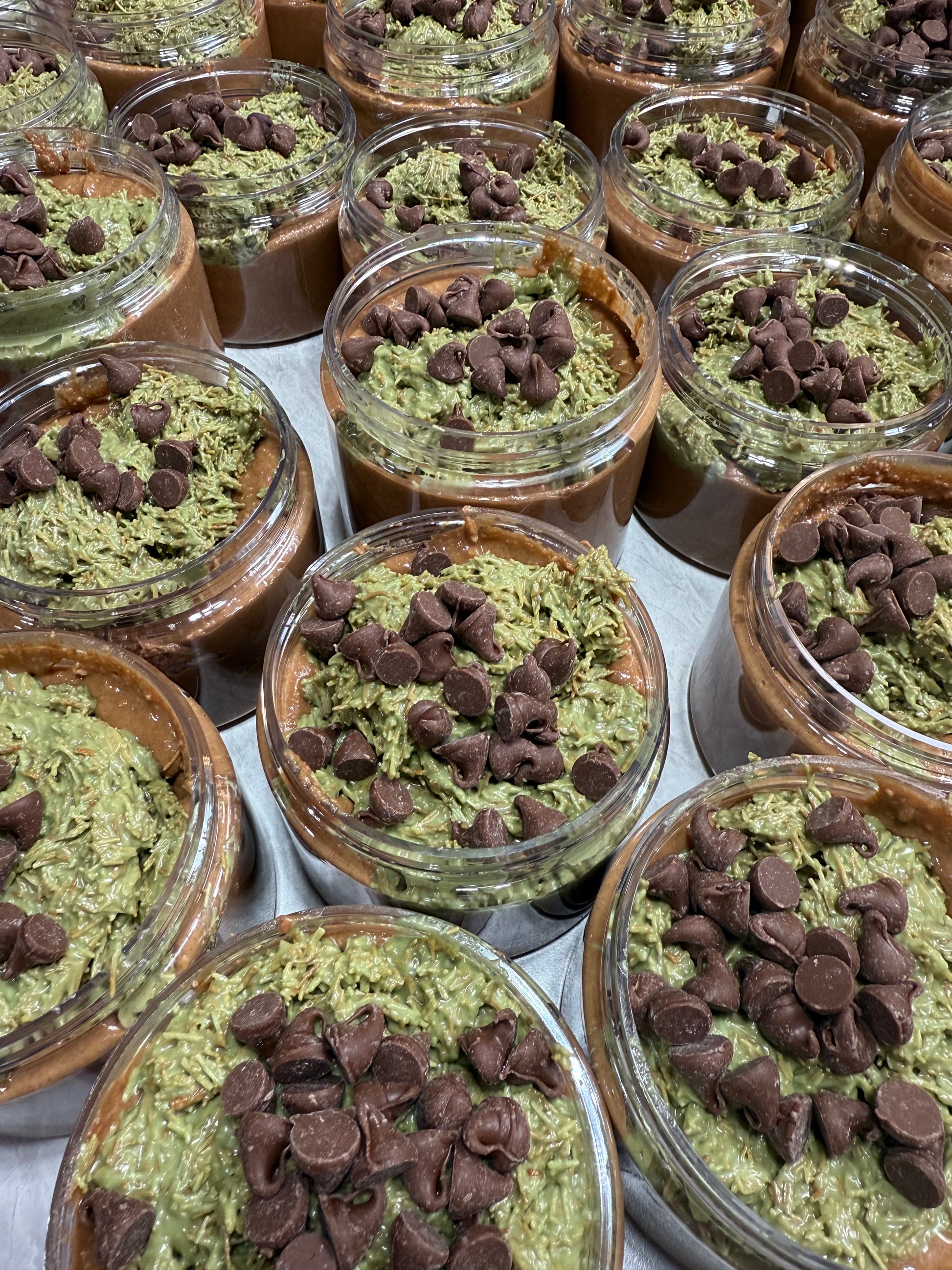 Dubai Chocolate is a rich indulgent treat that combines honey roasted milk chocolate peanut butter, pistachio kataifi cream, and milk chocolate chips.