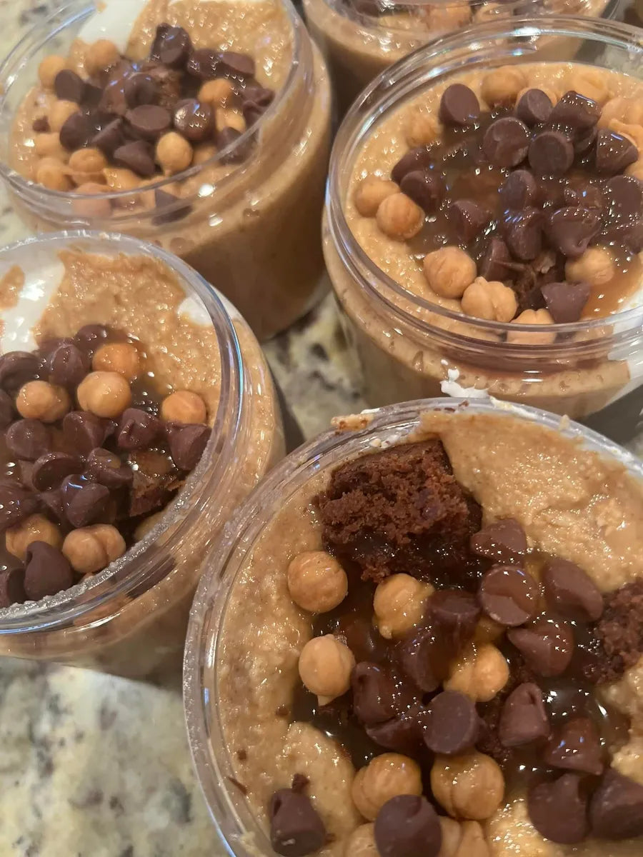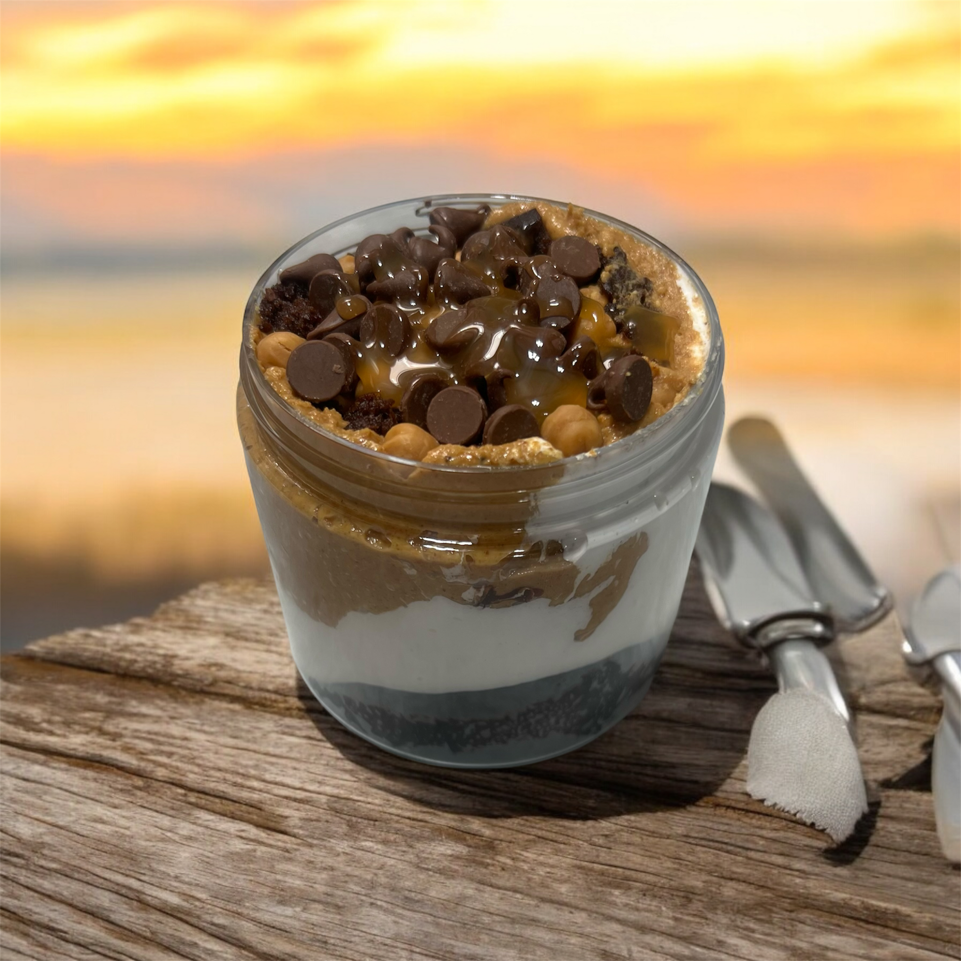 Introducing Fudge Brownie, a delectable fusion of rich peanut butter and decadent chocolate chips. Indulge in this irresistible treat, meticulously crafted for ultimate culinary satisfaction. Layered with Hot fudge, fluffing (marshmallow fluff and cream cheese icing), honey roasted peanut butter, homemade fudge brownie, caramel bits, milk chocolate chips. Drizzled with Sea Salted Caramel Sauce.