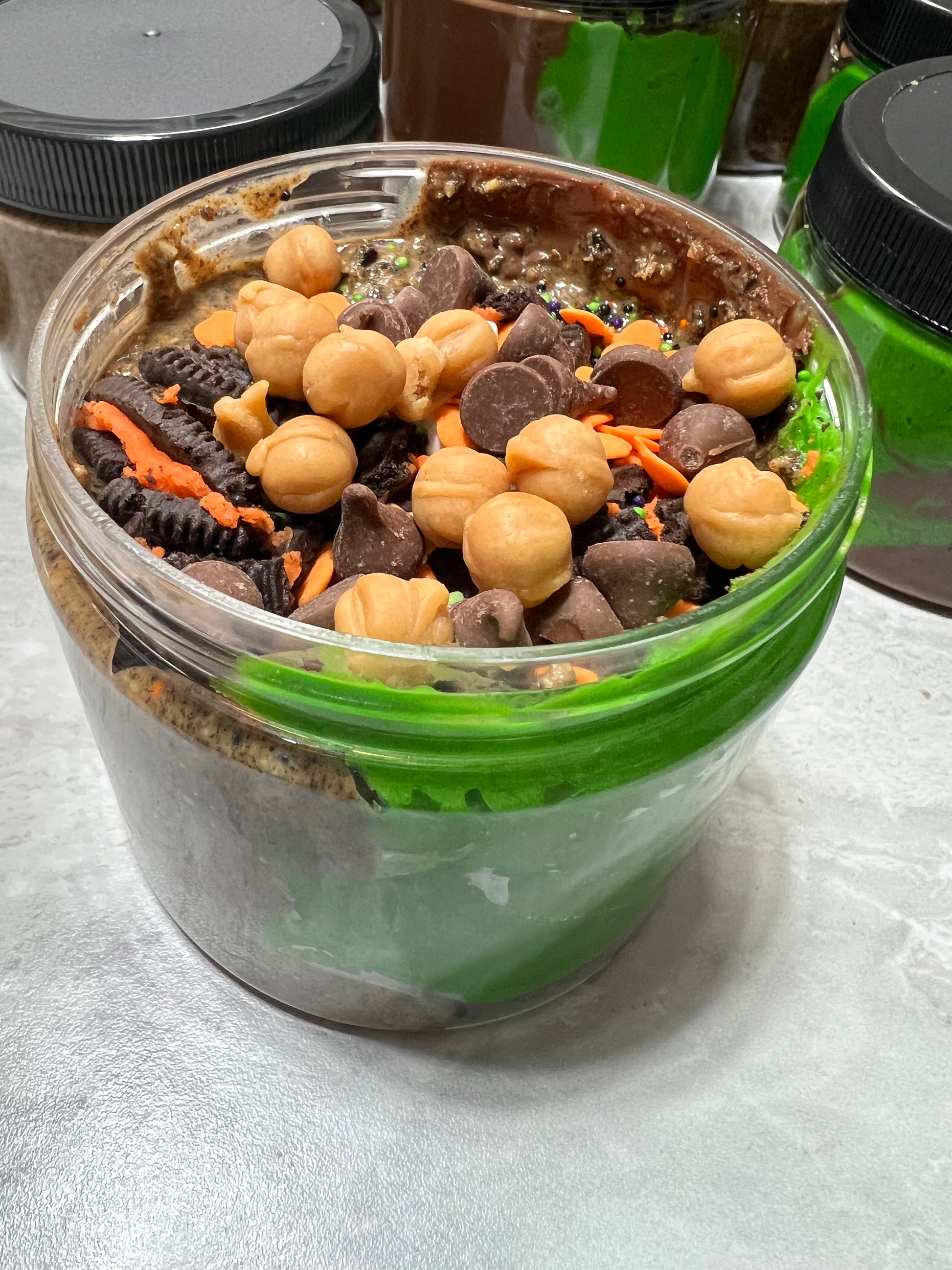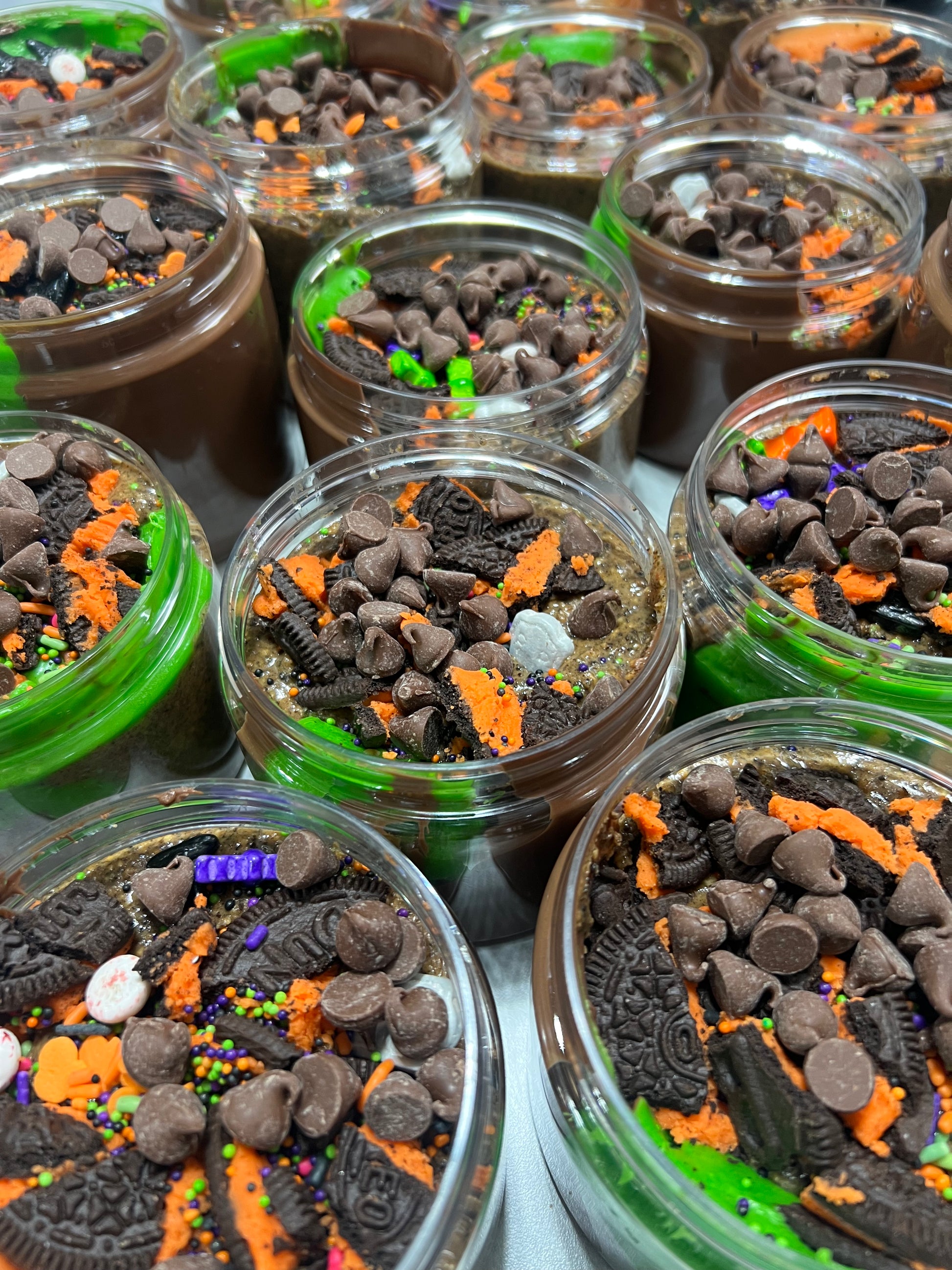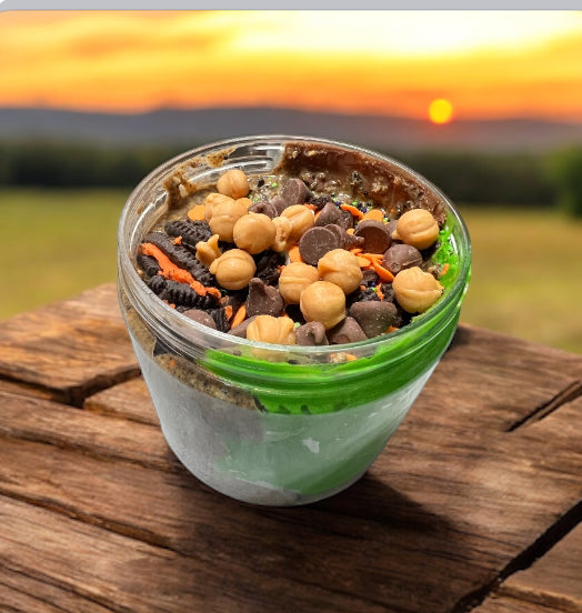 This is the scary version of our top seller, Cookie Jar! It is layered with Nutella, Oreo peanut butter, vanilla icing, caramel bits, milk chocolate chips, Oreo cookie crumbles and hard candy pieces. BOO!