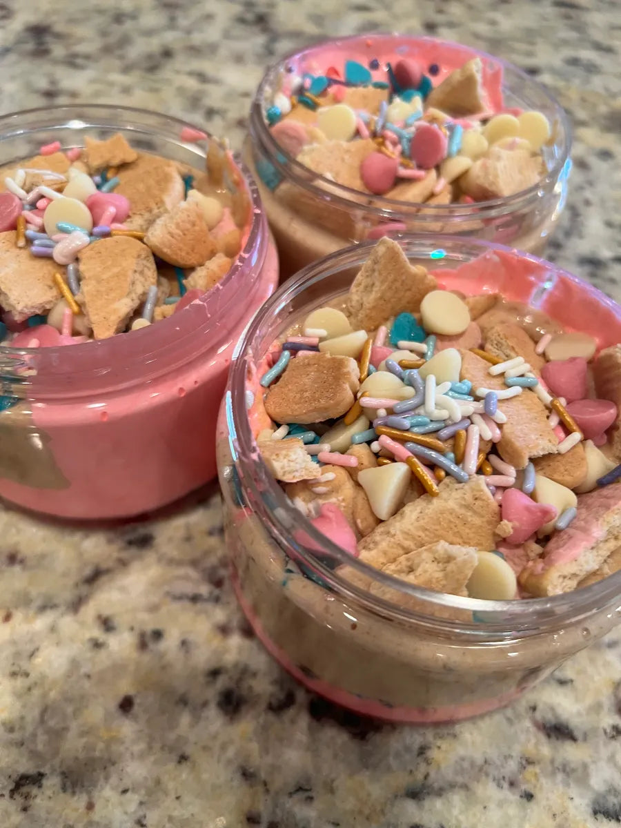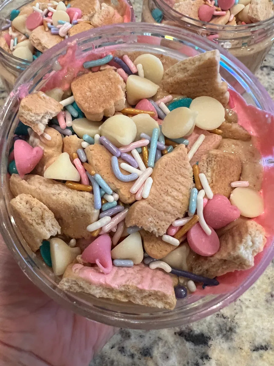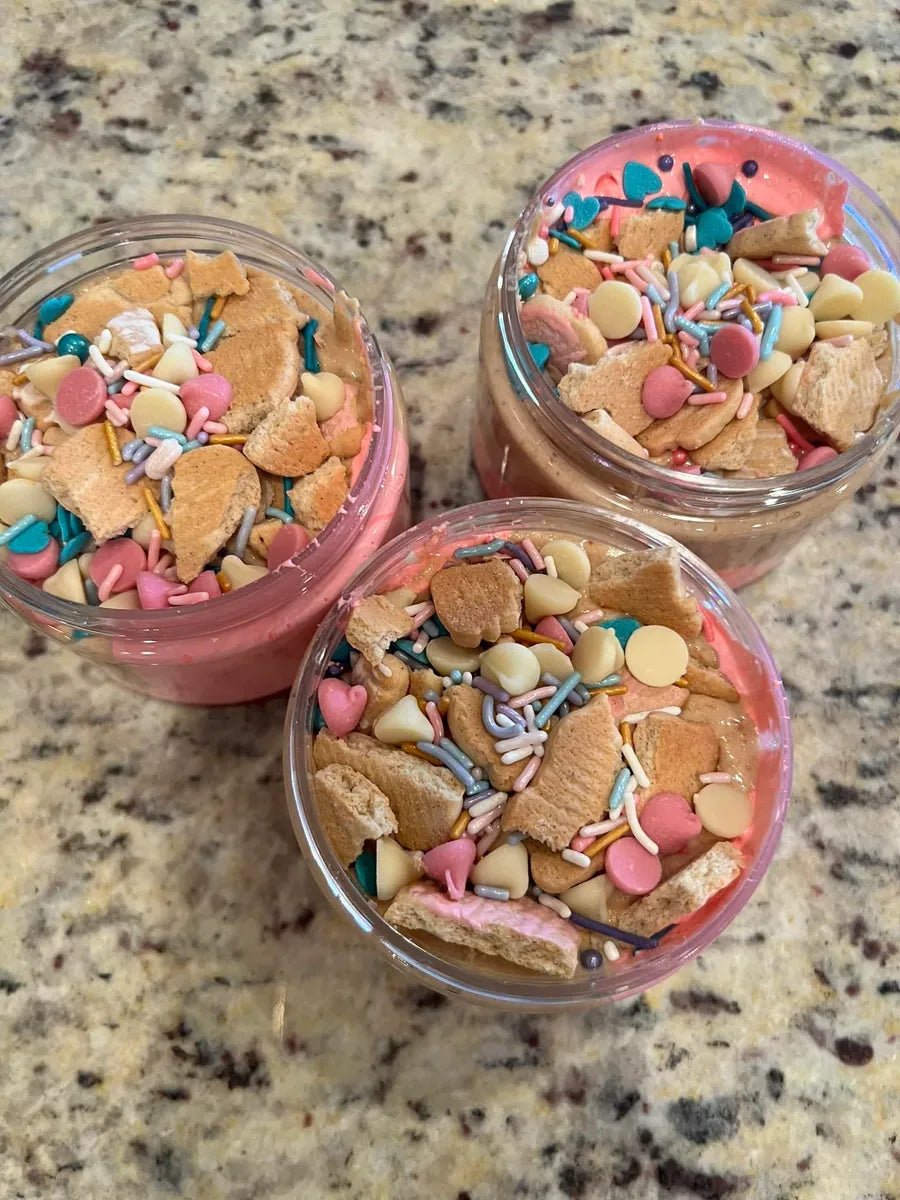 This jar is packed full of flavor and is so yummy! We start with strawberry sauce and then add pink fluff, then white chocolate honey roasted peanut butter followed by iced animal crackers and strawberry chips. The perfect combination to satisfy a snack craving!