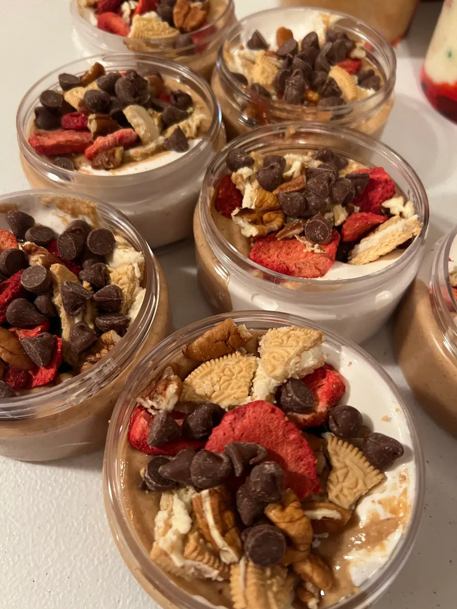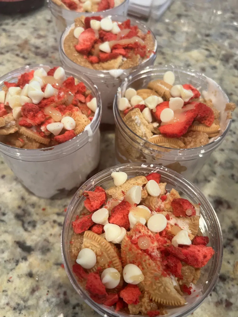 The best way to describe Very Strawberry is a fancy peanut butter sandwich. This amazing jars starts with strawberry jam and then we layer in homemade white chocolate peanut butter, marshmallow fluff, freeze dried strawberries, milk chocolate chips, vanilla cookie crumbles.